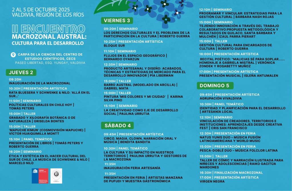 Del 2 al 5 de octubre, Valdivia se convierte en el corazón del sur austral con el segundo Encuentro Macrozonal Sur Austral “Cultura para el desarrollo”. Organizado por la Seremi de las Culturas de Los Ríos, este evento reunirá a comitivas de Los Ríos, Los Lagos, Aysén y Magallanes y de la Antártica Chilena en un espacio clave para el intercambio cultural, la reflexión y el fortalecimiento de la identidad de los territorios.